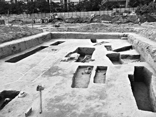 臨街的一處墓群目前呈現(xiàn)兩部分,一部分挖成了長方體,能看到一個(gè)被堵住的墓門,這部分北側(cè)則是一個(gè)圓形的墓口,內(nèi)里呈八邊形,目前已經(jīng)被木板簡單覆蓋。不遠(yuǎn)的另一個(gè)墓群則有很多白線畫好的遺骸位置,有幾具骸骨已經(jīng)完整露出地面,有工作人員拿著掃帚在一點(diǎn)點(diǎn)清理。