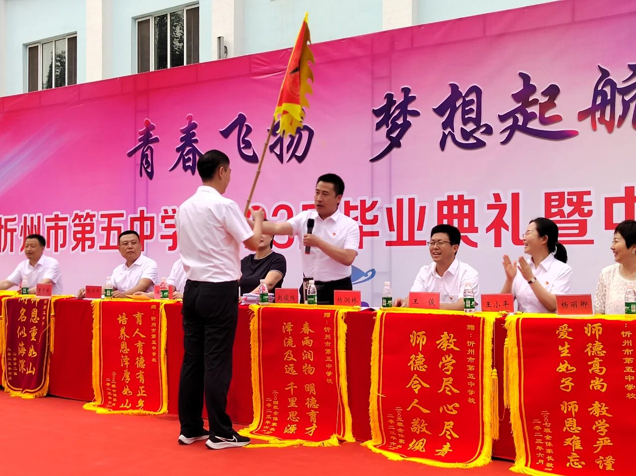 趙校長(zhǎng)發(fā)布中考沖鋒,并由董亮田主任授出征旗,三年的征途,是夢(mèng)想的基石,是光榮的荊棘路,是青春的禮贊,更是未來(lái)的希望。祝愿初三學(xué)子們六月中考蟾宮折桂,金榜題名,勇奪佳績(jī),再創(chuàng)五中的新輝煌!