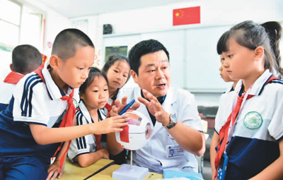 近日,在貴州省黔東南苗族侗族自治州從江縣城關(guān)第三小學(xué),眼科醫(yī)生給學(xué)生講解健康用眼知識。(石宏輝 攝 人民視覺)