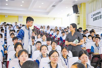 為增強(qiáng)青少年法治觀念,預(yù)防未成年人違法犯罪,構(gòu)建安全和諧的校園環(huán)境,近日,江蘇省鹽城市大豐區(qū)人民法院法官走進(jìn)鹽城市大豐區(qū)城東實(shí)驗(yàn)初級(jí)中學(xué),為該校400多名師生上了秋季開學(xué)法治第一課。圖為學(xué)生發(fā)言提問(wèn)法官解答。 董正遠(yuǎn) 蘇思文 攝 (責(zé)任編輯:梁艷) |