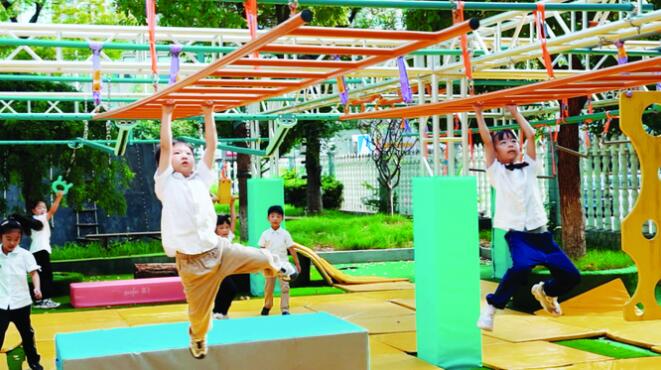 常州市五星幼兒園的負(fù)責(zé)人王艷表示,有一次同事將幾條外國(guó)幼兒園、小學(xué)低年級(jí)年齡段孩子進(jìn)行體能訓(xùn)練的視頻發(fā)了過(guò)來(lái),視頻上的孩子能夠完成跳鞍馬、手倒立行走等動(dòng)作?!坝谑?,我們結(jié)合孩子們的意見(jiàn),邀請(qǐng)專(zhuān)家共同繪制賽道構(gòu)思圖,將平衡、走、跑、跳、攀爬、懸掛等動(dòng)作元素融為一體,打造出一個(gè)綜合性的體能游戲賽道。”