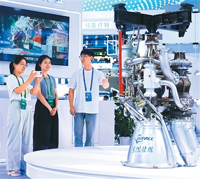 展區(qū)內(nèi),工作人員介紹焦點(diǎn)一號15噸液氮甲烷發(fā)動機(jī)。陳冬冬攝