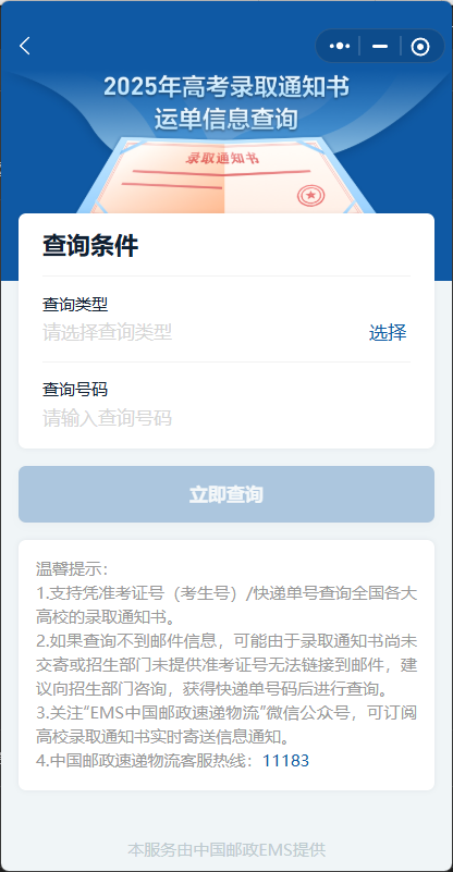 考生可以通過(guò)國(guó)務(wù)院客戶端小程序,進(jìn)行高考錄取通知書(shū)運(yùn)單信息查詢。?