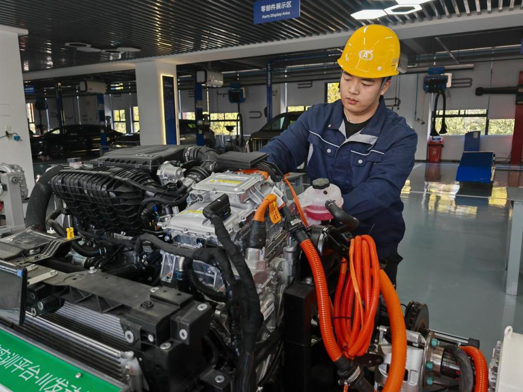 為支撐新能源汽車產(chǎn)業(yè)崛起,河南省全省高職院校開設(shè)相關(guān)專業(yè)點(diǎn)419個(gè),相關(guān)在校生22.14萬人。在河南機(jī)電職業(yè)學(xué)院與比亞迪共建的現(xiàn)場(chǎng)工程師學(xué)院,圍繞“現(xiàn)場(chǎng)工程師”培養(yǎng)開發(fā)了37門項(xiàng)目化課程。該校每年向鄭州航空港區(qū)比亞迪工廠輸送1000余名技能人才,不少學(xué)生迅速成長(zhǎng)為產(chǎn)線骨干?!皩W(xué)校通過‘項(xiàng)目+人才’雙交付育人模式,極大地增強(qiáng)了人才培養(yǎng)與企業(yè)需求的匹配度。”比亞迪總裝車間主任如是說。