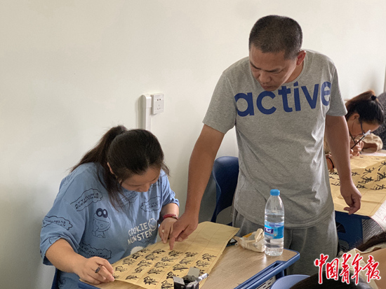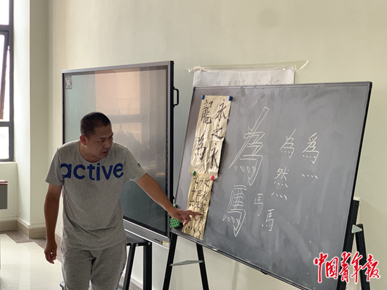 蔡偉在書(shū)法課上指導(dǎo)學(xué)生。