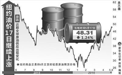 近期,國際原油價(jià)格屢現(xiàn)攀升,逼近每桶50美元。5月17日,截至當(dāng)日收盤,紐約商品交易所6月交貨的輕質(zhì)原油期貨價(jià)格上漲0.59美元,收于每桶48.31美元,漲幅為1.24%。7月交貨的倫敦布倫特原油期貨價(jià)格上漲0.31美元,收于每桶49.28美元,漲幅為0.63%。分析認(rèn)為,一些突發(fā)因素導(dǎo)致了近期油價(jià)攀升,國際油市實(shí)現(xiàn)供需平衡仍需時(shí)日。