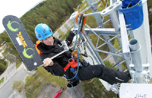 2016年5月12日,在芬蘭中部城市卡亞尼,工程師卡萊紐斯在一處基站塔頂調試華為公司生產的天線。(新華社)
