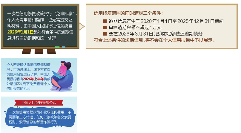 在進(jìn)行必要的技術(shù)準(zhǔn)備后,中國(guó)人民銀行于22日明確發(fā)布一次性信用修復(fù)政策有關(guān)安排。自2026年1月1日起征信中心將根據(jù)不同還款情形完成自動(dòng)調(diào)整,相關(guān)逾期記錄不再在個(gè)人信用報(bào)告中展示。