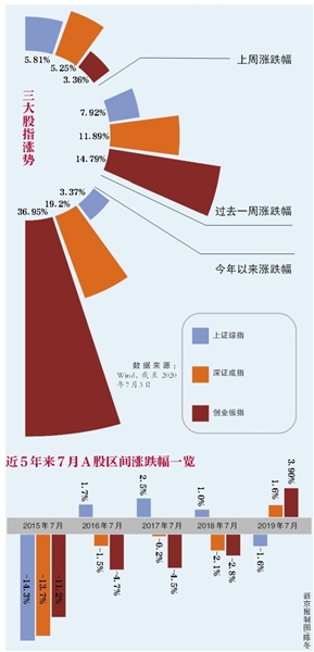 新京報記者統(tǒng)計了2010年7月-2019年7月間的數(shù)據(jù)發(fā)現(xiàn),事實上,指數(shù)在過去的10年中上漲與下跌的各約占半數(shù)。其中,滬指方面,近10年里,滬指6次在7月出現(xiàn)上漲,4次出現(xiàn)下跌。2010年7月為近10年的7月里上漲幅度最高的一年,漲幅為9.97%;2015年7月,滬指大幅下跌14.34%,是十年中7月跌幅最高的一年。