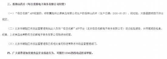 《通告》指出,北京市朝陽區(qū)市場監(jiān)督管理局執(zhí)法人員向“每日優(yōu)鮮”APP平臺(北京每日優(yōu)鮮電子商務(wù)有限公司)送達(dá)檢驗(yàn)報告,并開展現(xiàn)場檢查。經(jīng)查,上述食品由常熟每日優(yōu)鮮電子商務(wù)有限公司購進(jìn)并經(jīng)營。北京市朝陽區(qū)市場監(jiān)督管理局已將相關(guān)情況移送常熟市市場監(jiān)督管理部門。