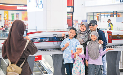 日前,在印度尼西亞雅加達(dá),乘客在雅萬(wàn)高鐵哈利姆站候車(chē)大廳與雅萬(wàn)高鐵高速動(dòng)車(chē)組模型合影。新華社記者 徐 欽攝
