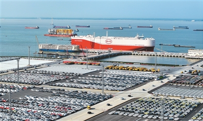 4月27日,搭載7000余輛比亞迪新能源商品車(chē)的汽車(chē)運(yùn)輸船比亞迪“深圳”號(hào)首航駛往巴西,創(chuàng)下國(guó)內(nèi)汽車(chē)單次出口量一個(gè)批次最多的紀(jì)錄。圖為運(yùn)輸船正在江蘇省蘇州港太倉(cāng)港區(qū)裝載汽車(chē)。計(jì)海新攝(人民視覺(jué))