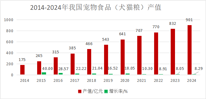 2014年至2024年我國(guó)寵物食品(犬貓糧)產(chǎn)值分析圖 (中國(guó)農(nóng)業(yè)科學(xué)院飼料研究所寵物營(yíng)養(yǎng)團(tuán)隊(duì)供圖)