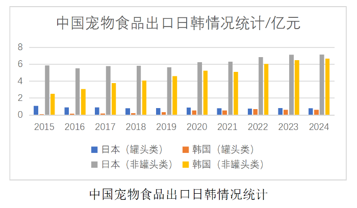 王金全分析認(rèn)為,日韓是我國(guó)寵物食品重要出口地,2022年占出口總額12%,中國(guó)品牌憑性價(jià)比與差異化切入日本市場(chǎng),2024年對(duì)韓非罐裝類出口額較2015年翻倍。