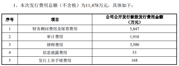本次發(fā)行費用(不含稅)共計1.15億元,其中中信證券、招商證券作為保薦機構獲得保薦、承銷費用5847萬元。