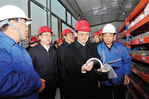 圖為市委書記李俊明在山西天寶集團(tuán)有限公司調(diào)研質(zhì)量可追溯系統(tǒng)建設(shè)情況。(本報(bào)記者 劉紀(jì)森 攝)