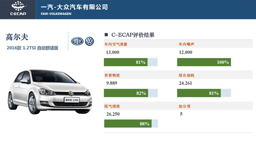 在本批次C-ECAP評價中,一汽-大眾高爾夫車型獲得截止至目前C-ECAP評價車型中的最高獎牌白金牌;廣汽傳祺是在C-ECAP中首次出現(xiàn)的中國品牌,與觀致車型一并獲得金牌;東風(fēng)本田哥瑞因在車內(nèi)噪音方面的相對得分較低,獲得銀牌。 中國汽車技術(shù)研究中心副主任張建偉向記者表示:在發(fā)改委、中宣部、科技部、財政部、環(huán)保部、住建部、商務(wù)部、質(zhì)檢總局、旅游局和國管局聯(lián)合制定了《關(guān)于促進綠色消費的指導(dǎo)意見》,以及國務(wù)院正式發(fā)布《中國制造2025》規(guī)劃后,汽車產(chǎn)業(yè)已經(jīng)開始向綠色制造推進。在此背景下,C-ECAP的推出將汽車在健康、節(jié)能、環(huán)保方面的品質(zhì)進行綜合考量,其對于汽車產(chǎn)品的要求比碰撞實驗更為細致全面。今后,C-ECAP評價還將把車型拓展至新能源車與進口車方面。