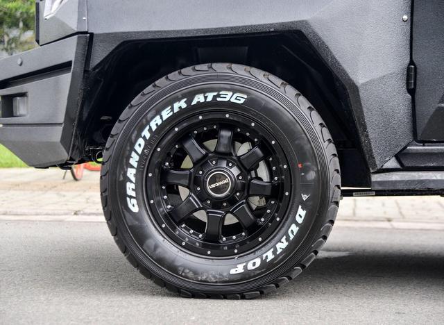 車身表面使用了亞光色涂裝,披上厚重的鋼板并經過高溫噴砂處理,車窗采用了高強度復合玻璃,厚度比起一臺iPhone7還要厚。幾乎全車做過了防彈處理和碳纖維處理,側面還取消了C柱和D柱,換裝了具有一定防爆能力的輪胎,據說輪胎支持在全部破損的情況下勻速行駛。