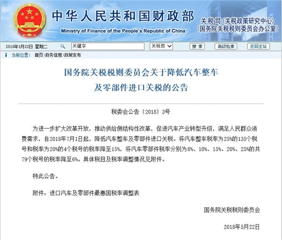 5月22日,國(guó)家財(cái)政部發(fā)布公告,自2018年7月1日起,降低汽車整車及零部件進(jìn)口關(guān)稅。將汽車整車稅率為25%的135個(gè)稅號(hào)和稅率為20%的4個(gè)稅號(hào)的稅率降至15%,將汽車零部件稅率分別為8%、10%、15%、20%、25%的共79個(gè)稅號(hào)的稅率降至6%。