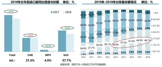 再以車型分類來(lái)看,2018年,三大進(jìn)口車型的銷量出現(xiàn)明顯分化。其中,轎車銷量增長(zhǎng)3.2%,是唯一保持增長(zhǎng)的車型;SUV的銷量占比雖達(dá)到57.7%,但其銷量卻出現(xiàn)15.6%的明顯下滑;MPV更是大幅下降32.8%。此外,進(jìn)口車排量下移也成為趨勢(shì),1.5升-2.0升排量進(jìn)口車的銷量占比從2014年的34.6%升至46.1%,達(dá)到較高水平;與之相對(duì),3.0升-4.0升排量進(jìn)口車銷量則出現(xiàn)較明顯的下滑。