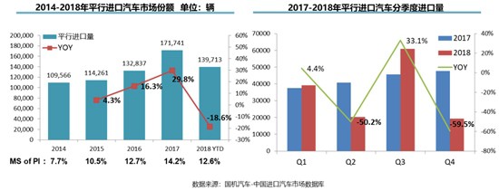 此外,2018年,平行進(jìn)口汽車銷量出現(xiàn)了5年來(lái)的首次下滑,且市場(chǎng)波動(dòng)明顯。2018年,平行進(jìn)口車銷量占進(jìn)口車總銷量的12.6%,達(dá)13.97萬(wàn)輛,同比下滑18.6%,下滑幅度遠(yuǎn)超進(jìn)口車市場(chǎng)整體表現(xiàn)。