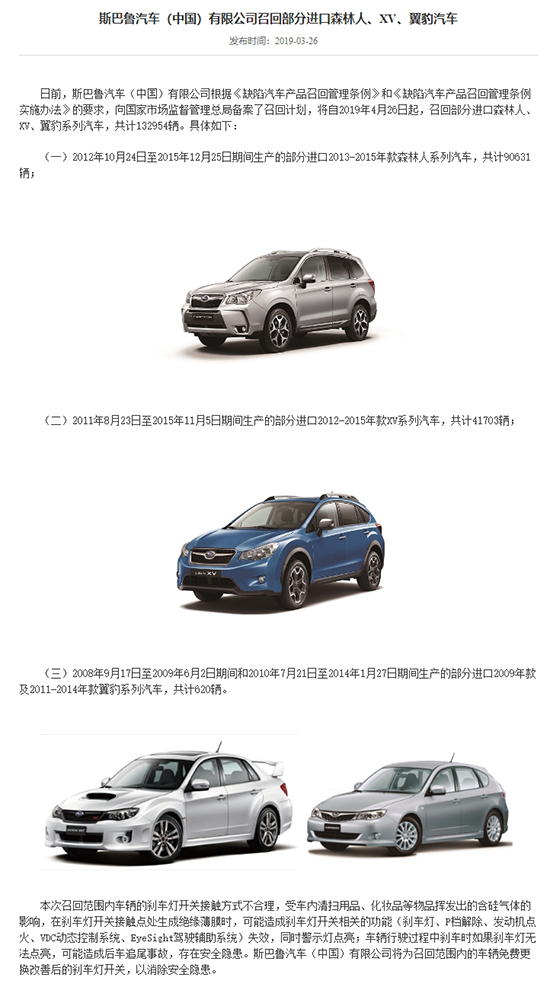 從召回原因來看,本月斯巴魯涉及132954輛汽車的召回不僅數(shù)量最大,召回原因也頗具“創(chuàng)意”。該批車輛因剎車燈開關接觸方式不合理,受車內清掃用品、化妝品等物品揮發(fā)出的含硅氣體的影響,在剎車燈開關接觸點處生成絕緣薄膜時,可能造成剎車燈開關相關的功能(剎車燈、P檔解除、發(fā)動機點火、VDC動態(tài)控制系統(tǒng)、EyeSight駕駛輔助系統(tǒng))失效,同時警示燈點亮;車輛行駛過程中剎車時如果剎車燈無法點亮,可能造成后車追尾事故,存在安全隱患。