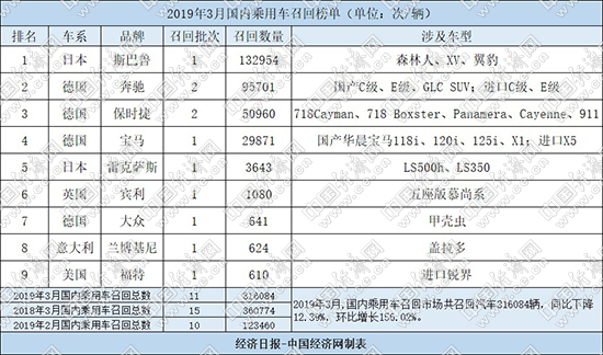 根據(jù)國家市場監(jiān)督管理總局缺陷產品管理中心3月份發(fā)布的召回公告,經濟日報-中國經濟網(wǎng)汽車頻道經過匯總、統(tǒng)計,整理出“2019年3月國內乘用車召回榜單”。3月,國內乘用車市場共有9個品牌累計發(fā)布9起召回公告,共計召回汽車316084輛,同比下降12.39%,環(huán)比增長156.02%。