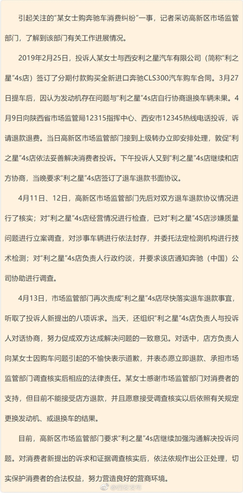 據(jù)西安市互聯(lián)網(wǎng)信息辦公室官方微博消息稱,4月13日,高新區(qū)市場監(jiān)管部門曾組織利之星4S店負責人與投訴人進行對話協(xié)商。對話中,店方負責人向奔馳女車主因購車問題引起的不愉快表示道歉,并表態(tài)愿立即退款、承擔市場監(jiān)管部門調(diào)查核實后相應的法律責任。該奔馳女車主感謝市場監(jiān)管部門對消費者的支持,但目前不能接受店方退款,也愿意接受調(diào)查核實以后依照有關(guān)規(guī)定更換發(fā)動機、或退換車的結(jié)果。