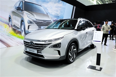 去年10月,現(xiàn)代汽車就在中國(guó)展出了氫燃料電池汽車現(xiàn)代NEXO。新京報(bào)記者 孫曉萌 攝