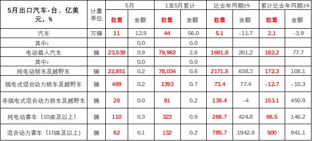 5月,我國出口汽車10.6萬輛,同比增長5.1%。其中,新能源汽車出口2.35萬輛,同比增長1661.8%。崔東樹認為,新能源汽車對車市實現高質量增長具有一定的拉動作用,同時也是國內汽車出口實現正增長的強大動力。