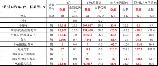 從進口額來看,5月汽車進口額為46.5億美元,同比增長4.6%;1-5月,汽車進口額為197.2億美元,同比下降6.3%。