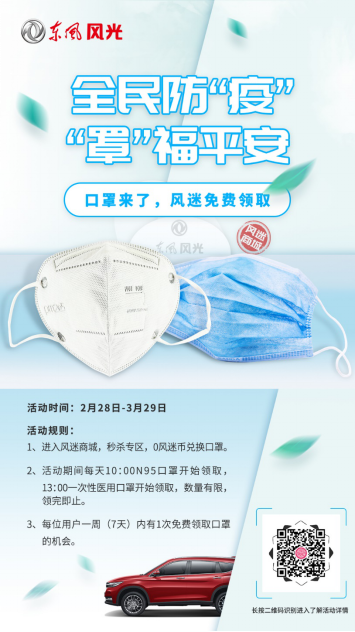 針對疫情期間“一罩難求”的問題,東風(fēng)小康公司推出了“萬只口罩限量免費領(lǐng)取”活動,從現(xiàn)在至3月29日,風(fēng)迷商城將每天免費送出100份N95、一次性醫(yī)用口罩,為用戶獻上專屬關(guān)愛。