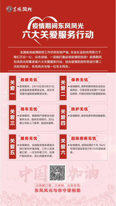同時,東風(fēng)小康公司旗下東風(fēng)風(fēng)光品牌還針對疫情特別推出“為愛同行,風(fēng)光助行”購車補貼全套解決方案,用戶線上支付99元訂車,即可抵扣1000-3000元現(xiàn)金,另享金融貼息至高8000元,低首付、零利息、包牌貸任選,同時置換購車尊享補貼至高10000元。此外,針對東風(fēng)風(fēng)光車主,東風(fēng)風(fēng)光品牌還推出了包括疫情期間道路救援費用全免、保養(yǎng)延期3個月、提供在線預(yù)約、上門保養(yǎng)、取送車服務(wù)等六大關(guān)愛政策,從救援、延保、用車、服務(wù)等全方位為用戶提供出行便利及保障。