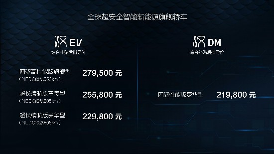 7月12日,比亞迪宣布“全球超安全智能新能源旗艦轎車”漢正式上市,上市車型包含三款漢EV和一款漢DM。全國(guó)綜合補(bǔ)貼后,漢EV超長(zhǎng)續(xù)航版豪華型售價(jià)22.98萬元、漢EV超長(zhǎng)續(xù)航版尊貴型售價(jià)25.58萬元、漢EV四驅(qū)高性能版旗艦型售價(jià)27.95萬元;漢DM四驅(qū)性能版豪華型售價(jià)21.98萬元。