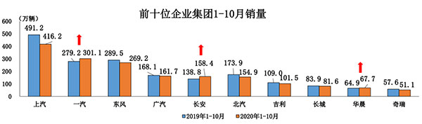 1-10月,汽車銷量排名前十位的企業(yè)集團銷量合計為1763.5萬輛,同比下降5.0%,占汽車銷售總量的89.5%,低于上年同期0.3個百分點。