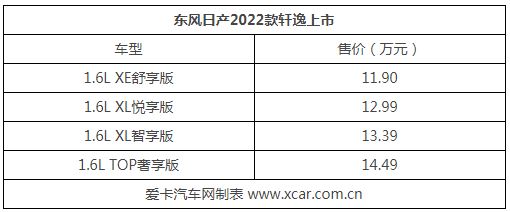 9月15日,東風(fēng)日產(chǎn)2022款軒逸正式上市,售價(jià)區(qū)間為11.9-14.49萬(wàn)元。2022款軒逸在外觀方面延續(xù)了現(xiàn)款車型的設(shè)計(jì),主要針對(duì)配置進(jìn)行提升,新增了EPKB電子手剎+Autohold自動(dòng)駐車、LDP車道偏離糾正系統(tǒng)等功能。詳細(xì)售價(jià)請(qǐng)見(jiàn)下表: