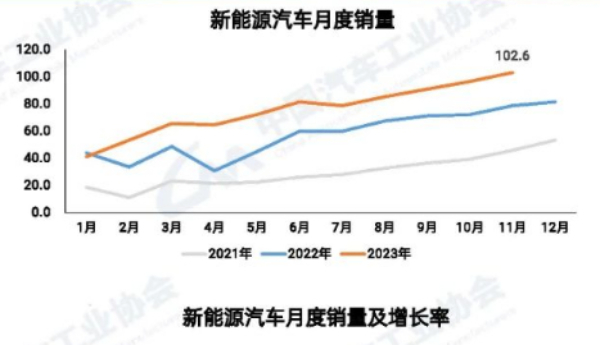 據(jù)中汽協(xié)數(shù)據(jù)顯示,2023年11月,我國汽車產(chǎn)量創(chuàng)歷史新高。汽車產(chǎn)銷量分別完成309.3萬輛和297萬輛,同比分別增長29.4%和27.4%。其中,新能源汽車月度產(chǎn)銷量首次雙超百萬輛,站上新臺階。11月,新能源汽車產(chǎn)銷量分別完成107.4萬輛和102.6萬輛,同比分別增長39.2%和30%。