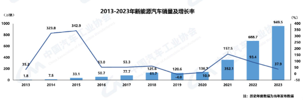據(jù)中汽協(xié)統(tǒng)計分析,2023年我國新能源汽車產(chǎn)銷分別完成958.7萬輛和949.5萬輛,同比分別增長35.8%和37.9%,市場占有率達31.6%。