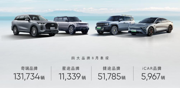 從品牌來看:四大主力乘用車品牌中,奇瑞品牌8月銷量131,734輛,1-8月累計銷量961,624輛,同比增長34.8%;星途品牌8月銷量11,339輛,1-8月累計銷量80,229輛,同比增長22%;捷途品牌8月銷量51,785輛,1-8月累計銷量316,446輛,同比增長95.5%,這一數字已超過捷途去年全年銷量;iCAR品牌首款產品上市6個月,8月份銷量5,967輛;今年以來累計銷量37,681輛。