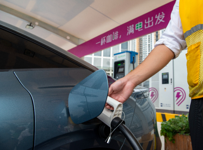 (資料圖片)工作人員為一輛新能源汽車(chē)插槍充電。新華社記者 徐嘉懿 攝