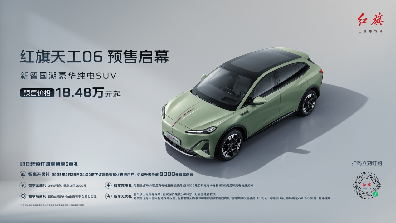 天工06定位新智國(guó)潮豪華純電SUV,除搭載了與天工05相同的司南智駕系統(tǒng)和靈犀座艙外,還配備了專(zhuān)屬超級(jí)適時(shí)智能四驅(qū)系統(tǒng),擁有毫秒級(jí)的四驅(qū)介入響應(yīng),既可為用戶(hù)提供卓越的四驅(qū)駕乘體驗(yàn),又能讓用戶(hù)享受兩驅(qū)的極低電耗。此次紅旗品牌智能體驗(yàn)日天工06正式開(kāi)啟預(yù)售,預(yù)售價(jià)格18.48萬(wàn)元起,并帶來(lái)豐厚的“智享五重禮”預(yù)訂權(quán)益。