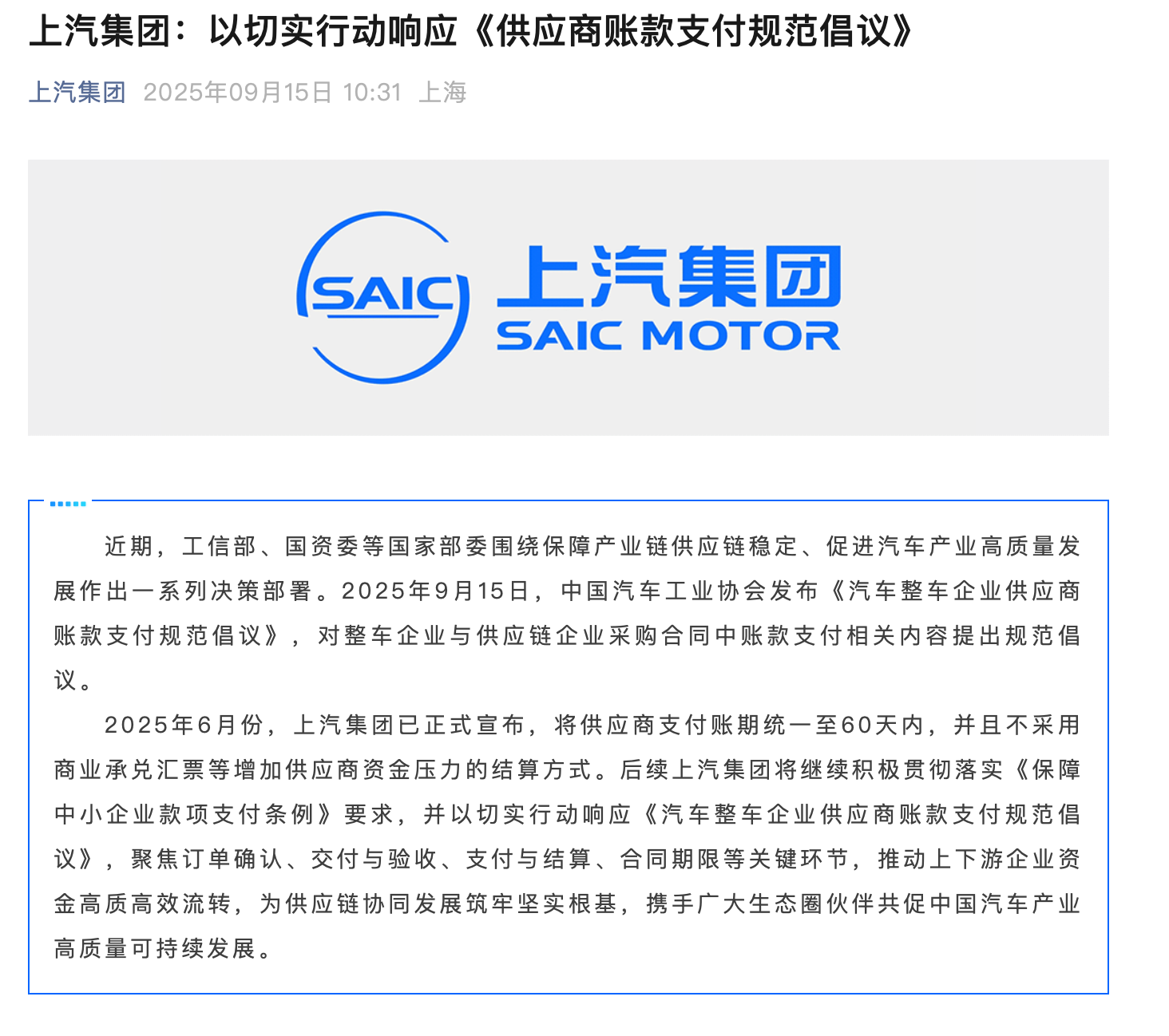 央廣網(wǎng)北京9月15日消息(記者董楠)9月15日,中國汽車工業(yè)協(xié)會(huì)(簡稱“中汽協(xié)”)發(fā)布《汽車整車企業(yè)供應(yīng)商賬款支付規(guī)范倡議》,提出為了推動(dòng)汽車行業(yè)落實(shí)《保障中小企業(yè)款項(xiàng)支付條例》,支持重點(diǎn)車企高質(zhì)量踐行供應(yīng)商賬期承諾,在充分協(xié)商的基礎(chǔ)上,對(duì)整車企業(yè)與供應(yīng)商企業(yè)采購合同中賬款支付相關(guān)內(nèi)容作出規(guī)范倡議,規(guī)范涉及訂單確認(rèn)、交付與驗(yàn)收、支付與結(jié)算、合同期限多個(gè)環(huán)節(jié)。