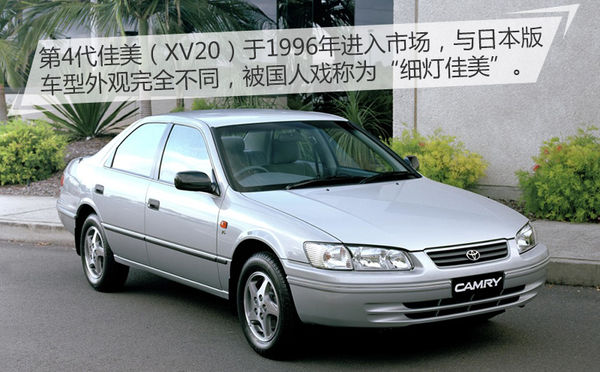 第4代佳美(XV20)于1996年進(jìn)入市場,進(jìn)入國內(nèi)的仍是佳美海外版車型,在設(shè)計(jì)上與日本本土版采用了完全不同的理念。讓整車看上去更加修長流暢,車頭和車尾都被設(shè)計(jì)得趨于扁平,由此帶來的是更細(xì)長的頭燈和尾燈,所以XV20在國內(nèi)被人們戲稱為“細(xì)燈佳美”。