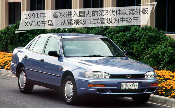 在5代之前,最先進(jìn)口引入國內(nèi)的是第3代佳美,這是非常具有歷史意義的一代車型,不但正式確立了佳美在豐田“全球車”陣營中的主力位置,還順帶打開了中國市場。首次進(jìn)入國內(nèi)市場的是第3代佳美(1991-1996)針對(duì)海外市場推出的XV10車型,與日本本土的V30不同,XV10從一輛緊湊級(jí)轎車“成長為”一輛B級(jí)車。