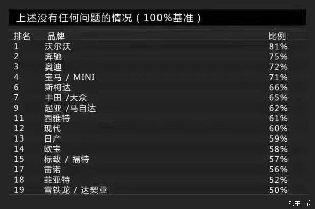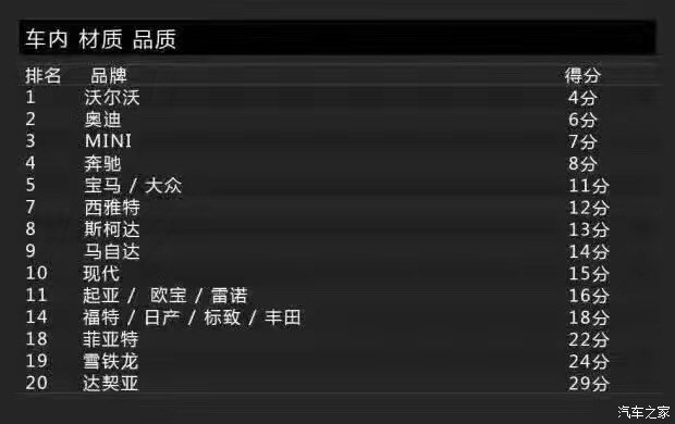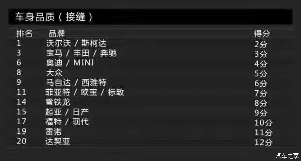 Bild調(diào)查的車(chē)身品質(zhì)(接縫)主要包括車(chē)身品質(zhì)、開(kāi)關(guān)門(mén)的手感、鋼板接縫及經(jīng)常與身體接觸的地方。沒(méi)錯(cuò),這一單項(xiàng)表現(xiàn)最佳的是沃爾沃,得分為2分。這里小編要敲黑板提醒大家注意了:在車(chē)身品質(zhì)(接縫)滿(mǎn)意度上,得分最低表現(xiàn)最好。當(dāng)然,斯柯達(dá)也得到了2分,寶馬、奔馳則同為3分。而得分最高的就是前面提到的達(dá)契亞,它的得分是12分,換句話(huà)說(shuō)就是達(dá)契亞是車(chē)身品質(zhì)滿(mǎn)意度最低的品牌。有意思的是與達(dá)契亞一起墊底是法系品牌雷諾,它的得分是11分。