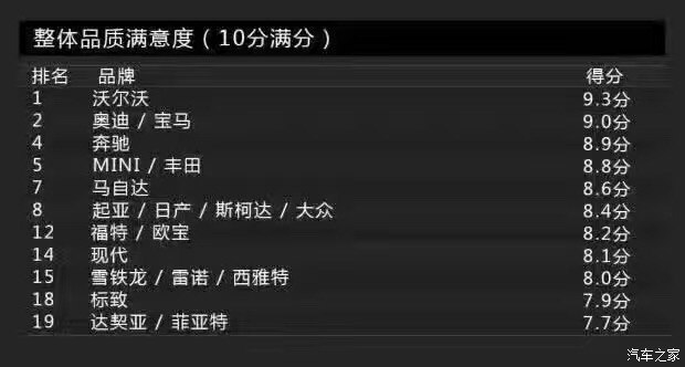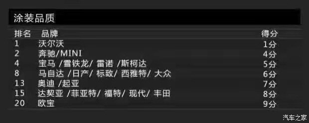 再來(lái)看看涂裝品質(zhì)方面,涂裝主要包括車(chē)漆亮度與耐腐蝕性。還是老規(guī)矩,得分最低就代表消費(fèi)者滿(mǎn)意度最高(下同)。沃爾沃的得分為1分,依然占據(jù)榜首的位置,或許排名第二的奔馳為4分,但跟沃爾沃差距有點(diǎn)大。得分最高的則是歐寶,為9分。另外,達(dá)契亞也有8分。