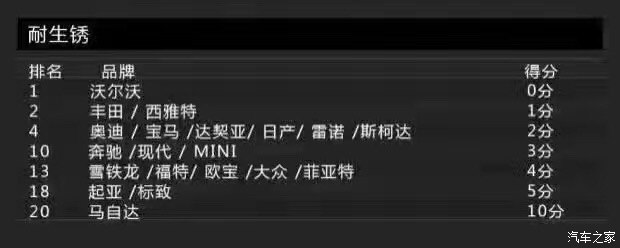 接下來(lái)這個(gè)項(xiàng)目的得分情況讓小編的心碎了一地,那就是耐生銹品質(zhì)。沃爾沃一如既往的穩(wěn)定,憑借0分的表現(xiàn)力挫群雄,險(xiǎn)勝豐田及西雅特這兩個(gè)品牌。值得關(guān)注的是,這次的倒數(shù)第一名竟換成了馬自達(dá),日系得了10分實(shí)屬少見(jiàn)。本來(lái)小編就打算入手一臺(tái)阿特茲,看到這個(gè)表現(xiàn),立馬變得很猶豫了有木有!生銹,生銹,居然生銹?