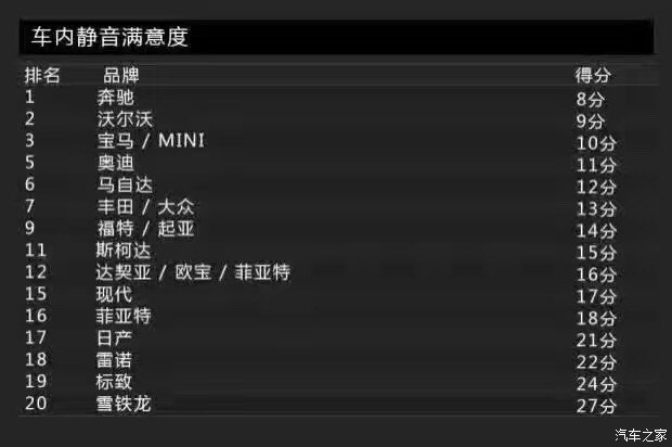 Bild這次調(diào)查的車(chē)內(nèi)靜音品質(zhì)上,排名第一的是奔馳,它的得分為8分,而排在第二名的則是沃爾沃,它的得分為9分。寫(xiě)到這里,小編不得不說(shuō):老哥,真穩(wěn),服!滿(mǎn)意度最低的則是雪鐵龍,又是法國(guó)車(chē)企,Auto