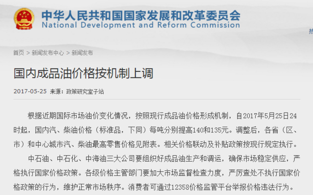 昨日(25日),國家發(fā)展和改革委員會發(fā)布消息稱,根據(jù)近期國際市場油價變化情況,按照現(xiàn)行成品油價格形成機制,自2017年5月25日24時起,國內(nèi)汽、柴油價格(標(biāo)準(zhǔn)品,下同)每噸分別提高140和135元。相關(guān)價格聯(lián)動及補貼政策按現(xiàn)行規(guī)定執(zhí)行。