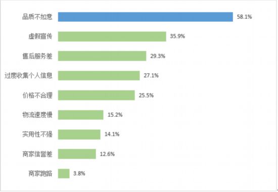 56.5%的受訪者表示對當(dāng)前的消費環(huán)境比較放心或非常放心。58.1%的受訪者對當(dāng)前商品/服務(wù)不滿意的首要原因是“品質(zhì)不如意”,“虛假宣傳”也是受訪者反映較為集中的不滿意原因,占比超過35.9%?!笆酆蠓?wù)差”(29.3%)、“過度收集個人信息”(27.1%)等方面也是造成受訪者對現(xiàn)有消費商品和服務(wù)不滿意的重要原因。